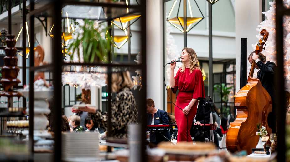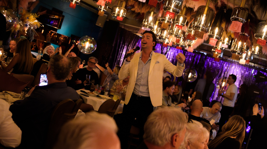 Als Tino Martin onder luid applaus opkomt, is de sfeer uitgelaten in Encore by Simonis in Scheveningen. Gasten zingen mee, er wordt geklapt en gedanst. Een aantal tafels geniet nog van sushi, dim sum en gerechten van de grill. Het is pas 15.30 uur én zondag, maar het voelt als een uitbundige zaterdagavond.