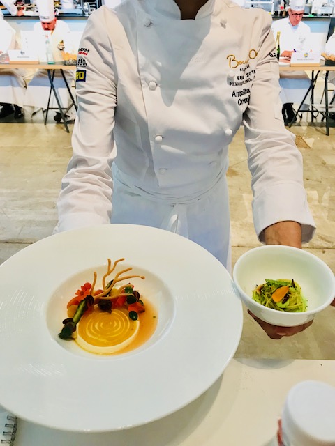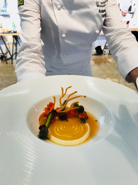 Het was een geweldige dag. De mannen waren vanmorgen om 6.00 uur met het uitladen van de koelbus en het inrichten van de keuken. Daarna volgde het inkopen doen op de beursvloer en startte het koken. Drost en Klaassen hebben een prachtige prestatie geleverd en presenteerden maandag 11 juni om 15:30 hun gerechten aan de jury.