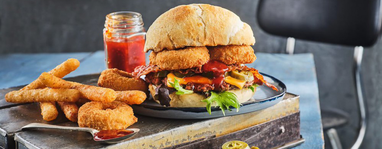 Gebruik fingerfood als mozzarella onion rings niet alleen als bijgerecht, maar ook als topping op een burger. Bestel nu je gratis proefmonster.
