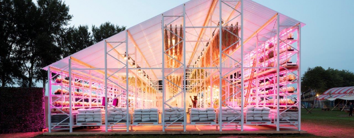 Brasserie 2050 is echter meer dan alleen een culinair voorproefje op de toekomst. Want wat is een toekomst zonder high tech? Neem de Smart Toilets van ontwikkelaar Imec, die tijdens Lowlands in het pop-uprestaurant te vinden waren. Dit zijn slimme toiletten die inzicht geven in de gezondheid van de gebruiker en op basis daarvan een gepersonaliseerd voedingsadvies geven. Zo meten sensoren in de bril en pot hartslag, zuurstof- en zoutgehalte, bloeddruk en de samenstelling van de urine. Wie een hoge hartslag heeft, krijgt het advies gerechten te kiezen met veel vezels en vocht. En ook een staaltje high tech: het volledig demontabele en herbruikbare paviljoen. Een ‘moderne boerenschuur’ zoals de architecten van Overtreders W het noemen. Ze vertellen: “Bouwen voor de toekomst is circulair bouwen: zorgen dat er geen grondstoffen verloren gaan. Deze voedselschuur van de toekomst is gemaakt van geleende, gehuurde en demontabele standaardmaterialen die allemaal hun restwaarde behouden. De hoofdconstructie bestaat bijvoorbeeld uit standaard palletstellingen, de tafels zijn gemaakt van gerecycled plastic en de gevel wordt gevormd door vertical farming-kasten gevuld met keukenkruiden. De gitterboxen gevuld met graan zorgen ervoor dat het paviljoen niet wegwaait.” Iets wat tijdens de Horecava uiteraard niet zal gebeuren. Daar is Brasserie 2050 binnen te vinden, in hal 5 om precies te zijn.