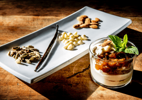 Vandaar dat ook de desserts op het verrassingsmenu gemaakt worden met een basis van Debic. “Een panna cotta met ijs bijvoorbeeld. Of denk aan een parfait met vijgencompote, gemaakt van vijgen uit eigen tuin.” De desserts worden aangepast naar het seizoen. In de zomer fris, en in de winter met spices. Hij is nu met Zaagemans bezig een zevengangenmenu voor te bereiden voor een groep bestuurders uit de wijk. Het dessert is al bedacht: een mousse met laagjes amandelcake. Met als basis de Debic Cream Plus Mascarpone, een mix van room en mascarpone. Daardoorheen witte chocolade en kardemon. “Slaat het aan, dan belandt het misschien wel op de kaart.”