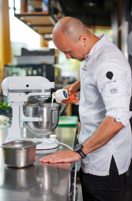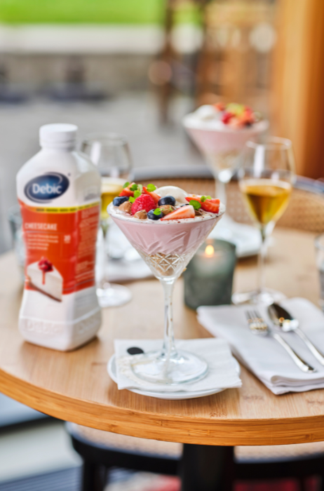 Momenteel test hij een nieuw product van Debic: Cheesecake, dat sinds begin september op de markt is. “Die gaat zijn plekje wel verdienen. Omdat je er zoveel kanten mee op kan. Het is makkelijk en toch creatief, zeker voor grote groepen. Bij een walking dinner voor vierhonderd man, maken we zelf de dessertjes. Lukt gewoon. We mengen de Debic Cheesecake nu met kokos, als cremeux in een macaron. De verpakking is ideaal voor hygiënechecks, je hoeft niet zelf te stickeren. Het contact met Debic is goed. Het is een fijne samenwerking. Voor iemand die graag met mensen werkt is dat heel fijn.”