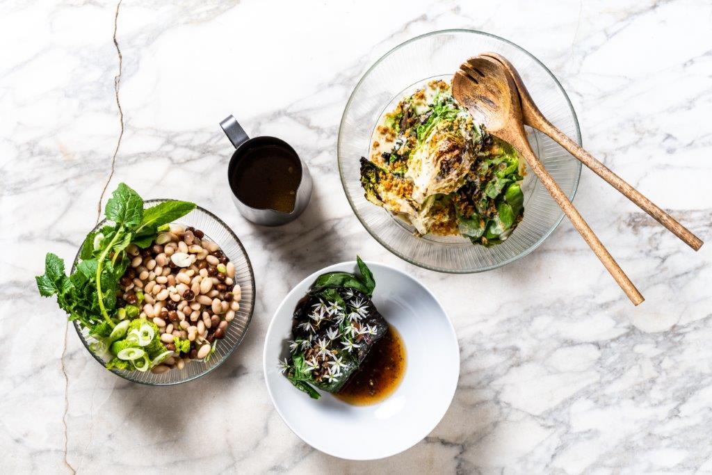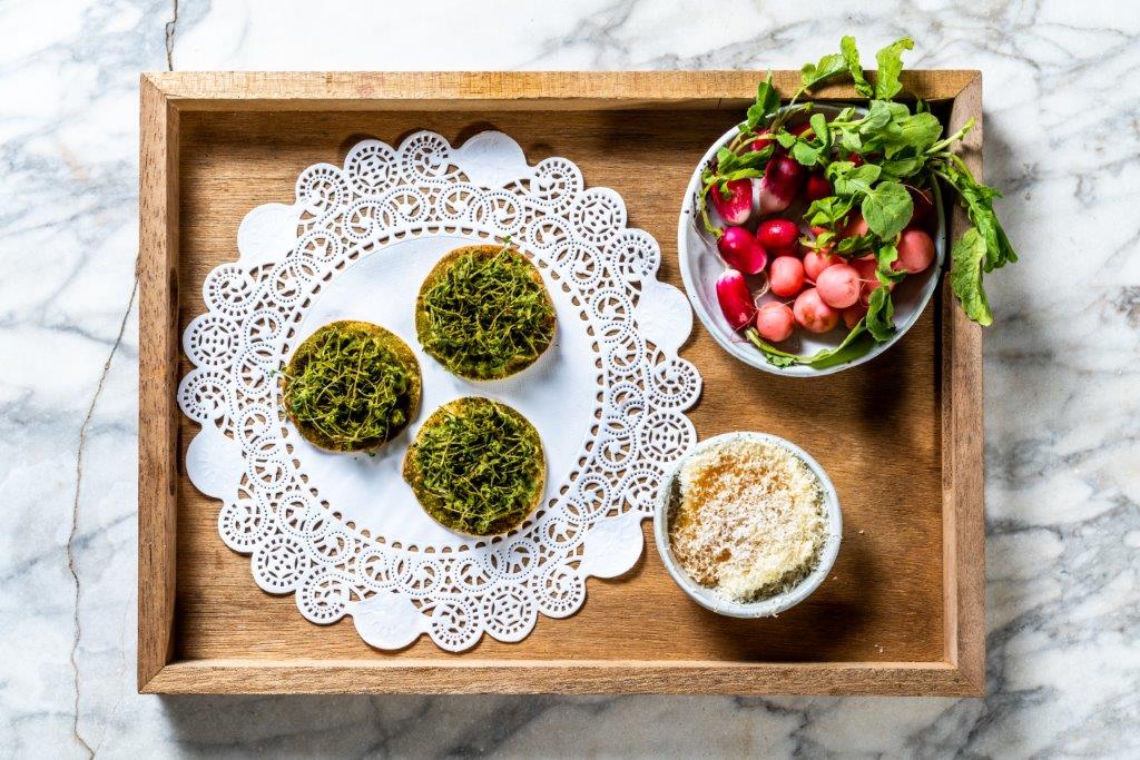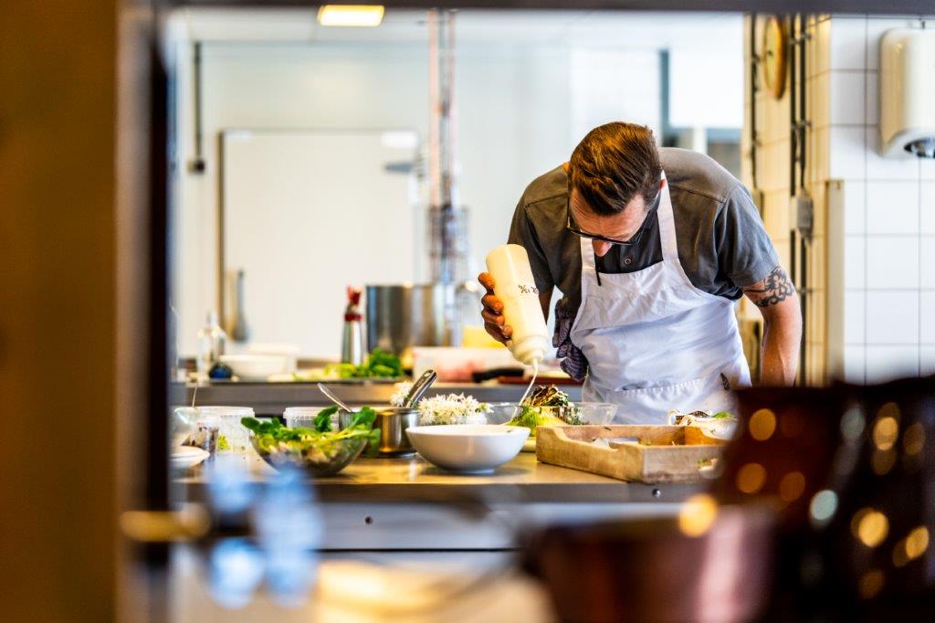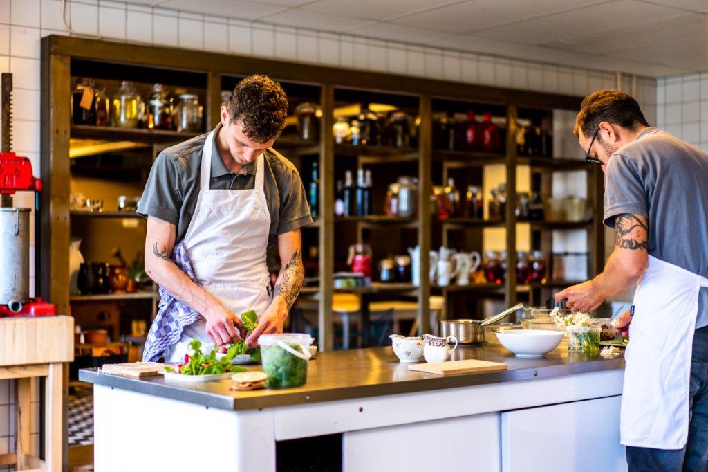 De chefs gebruiken in het voor-, hoofd- en nagerecht die volgen zo veel mogelijk producten van dichtbij. Van Zijl: “Zo plukken wij veel kruiden en bloemen in onze binnentuin en wilde gewassen op het landgoed, denk aan rozen, vogelmuur, bramen, daslook, watermunt, magnolia en pinksterbloemen. We vangen zelfs rivierkreeftjes in de sloot die is gekoppeld aan de Vecht. Simpelweg omdat wij daar een voorliefde voor hebben én omdat het past bij DeZusters.” Het bokjesvlees dat deze avond op het menu staat, komt ook uit de buurt: uit Haarzuilens. Het gerecht is grof, maar toch verfijnd, legt Van Zijl uit. “Eenvoudig en complex tegelijkertijd. Dat geldt voor alle andere gerechten ook: niet te veel gepriegel en kleine componenten. Je zou het comfort food kunnen noemen. We proberen op sommige vlakken zelfs een tikje tuttigheid in te brengen, maar dan wel op een moderne manier.” Het werken volgens het table d’hôte-principe kent, aldus Van Zijl, voor de keuken voor- en nadelen. “Doordat je maar één menu hebt, houd je meer focus op de gerechten dan bij een à-la-cartemenu en het is prijstechnisch voordeliger. Een nadeel is dat je veel gerechten tegelijk moet meegeven. Het heeft veel aandacht en mise-en-place nodig om dat perfect te laten verlopen.”
