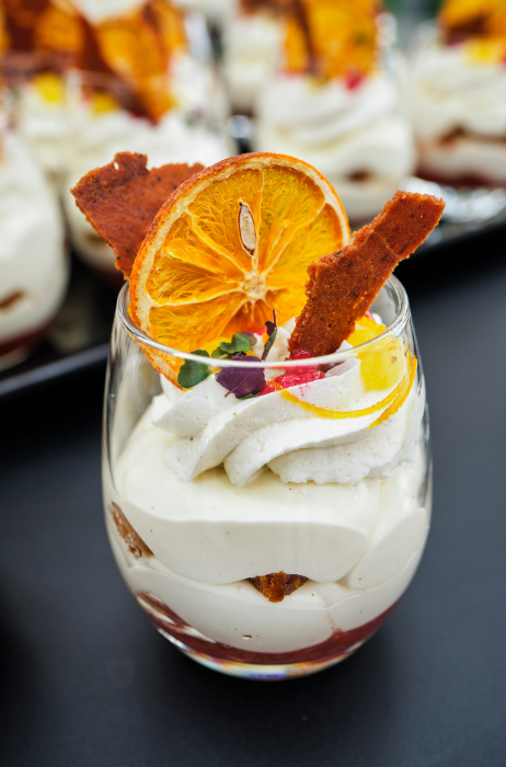 Executive chef Edwin Terpstra van Next Venue – een bedrijf met diverse evenementenlocaties, waaronder de Midden Nederland Hallen in Barneveld – is gewend om voor grote partijen desserts te maken. Dat valt of staat met een goede voorbereiding en het werken met slimme producten. Voor het nieuwe glasdessert gebruikt hij onder meer Debic Duo 50/50; een nieuwe, hybride room die voor 50% plantaardig is.
