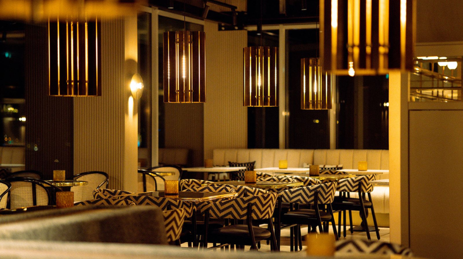 Naast het restaurant heeft Current Rooftop ook een intieme bar waar gasten terecht kunnen voor een breed assortiment aan champagnes en een aantal bar bites. Het mondaine interieur bestaat uit veel goud, paars en velvet, planten en een met leer beklede bar als center piece.
