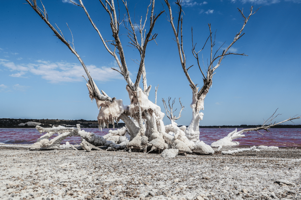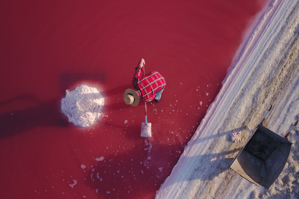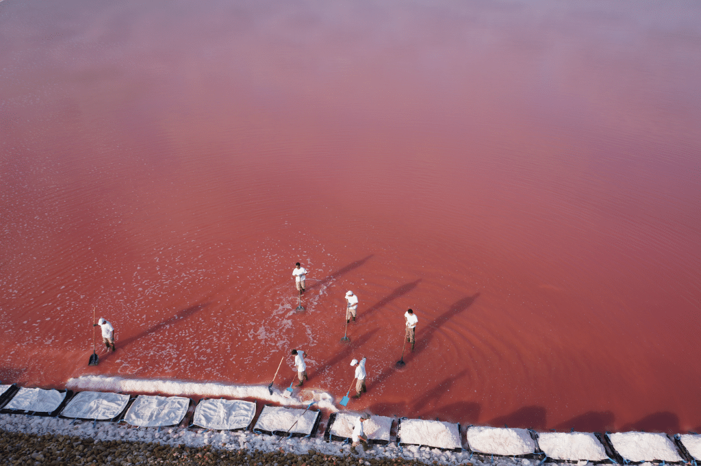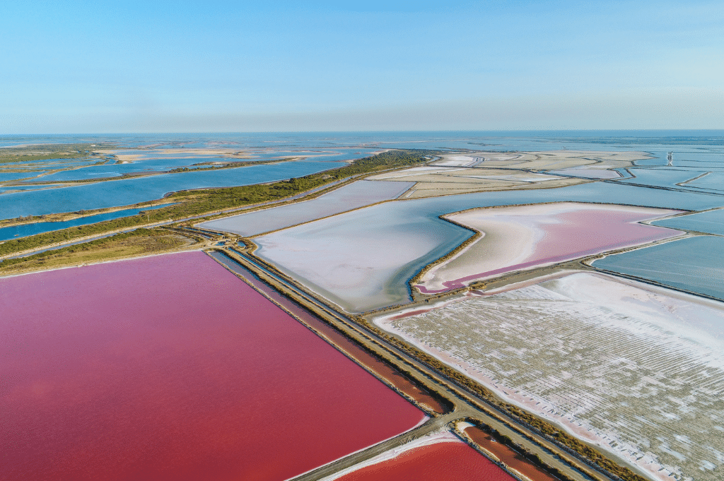 Het is een schitterend gezicht: zoutpannen zover het oog reikt. Ze kleuren diepblauw, okergeel, oranje en verschillende tinten roze. Aan de andere kant blikkeren hoge witte piramides van zout in het felle Zuid-Franse zonlicht. ‘Camels’ worden ze genoemd, naar de bulten van een kameel. Luc Vernhes tuurt in de verte. Hij is 71 en al veertig jaar ‘saunier’: zeezoutmaker. Eigenlijk is hij met pensioen, maar hij is nog elke dag in de zoutvelden te vinden. De jonge generatie kan niet zonder zijn kennis. Vernhes kent vijftig tinten roze, grapt hij. Aan de tint van het water kan hij zien hoe lang het nog duurt voor er kan worden begonnen met de zoutoogst. De tint van vandaag: zuurstokroze. “Het water kleurt roze door een alg die goed gedijt in zout water”, zegt hij. “Hoe hoger het zoutgehalte, hoe dieper de kleur roze. Nog een week. Misschien twee. Dan beginnen we.”