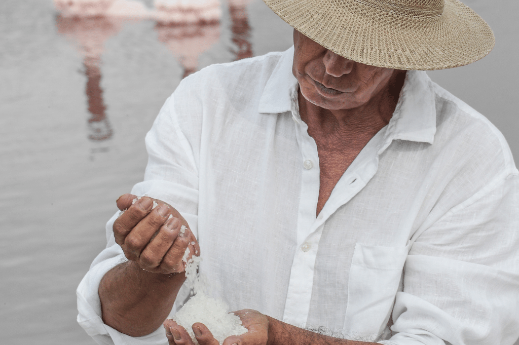 Het is begin juli. Bijna vier maanden geleden heeft Vernhes de sluis naar zee opengezet en het zeewater binnengelaten. Via een ingenieus systeem van kanalen en ondiepe bedden is het water vervolgens zigzaggend door het landschap gereisd. Het zoutwinningsysteem werkt nog exact hetzelfde als aan het begin van de christelijke jaartelling, toen Peccius, een Romeinse ingenieur, het ontwerp voor de zoutpannen bedacht. De zoutbedden zijn ondiep waardoor er door de zon en de wind steeds meer water verdampt. Daardoor wordt het zoutgehalte steeds hoger. Zeewater bevat 25 gram per liter. Vier maanden later en veertig kilometer verderop is dat 250 gram.