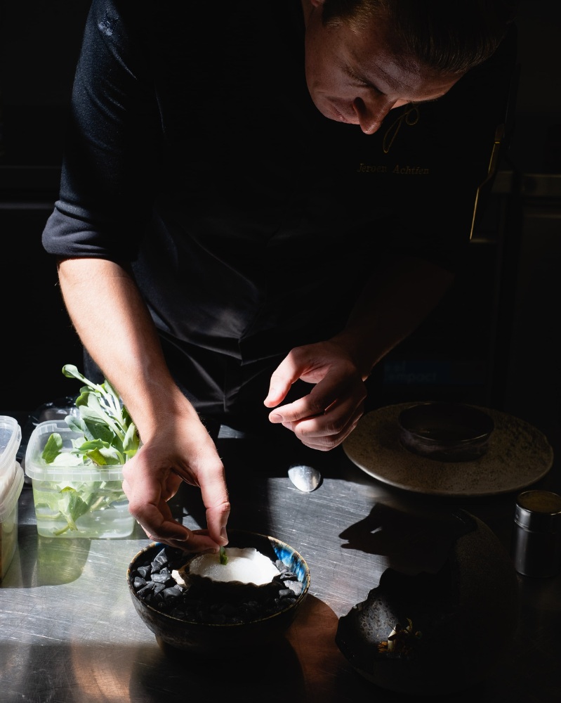 Chef-kok Jeroen Achtien werkte lange tijd als sous-chef bij De Librije*** en vertrok vijf jaar geleden met zijn vrouw Sanne naar Zwitserland. Daar opende hij het fine dining-restaurant Sens** in Hotel Vitznauerhof. De nuchtere Friese chef-kok hoorde echter over een nieuw avontuur via Flip Dejaeghere, van foodblog Flip World Foodie. Hij komt minstens één keer per jaar eten bij Sens**, vertelt Achtien. “De laatste keer dat hij hier was, zei hij: ‘Ik heb heerlijk gegeten, maar ik heb het gevoel dat er meer in zit. Hier komt dat er niet uit’."