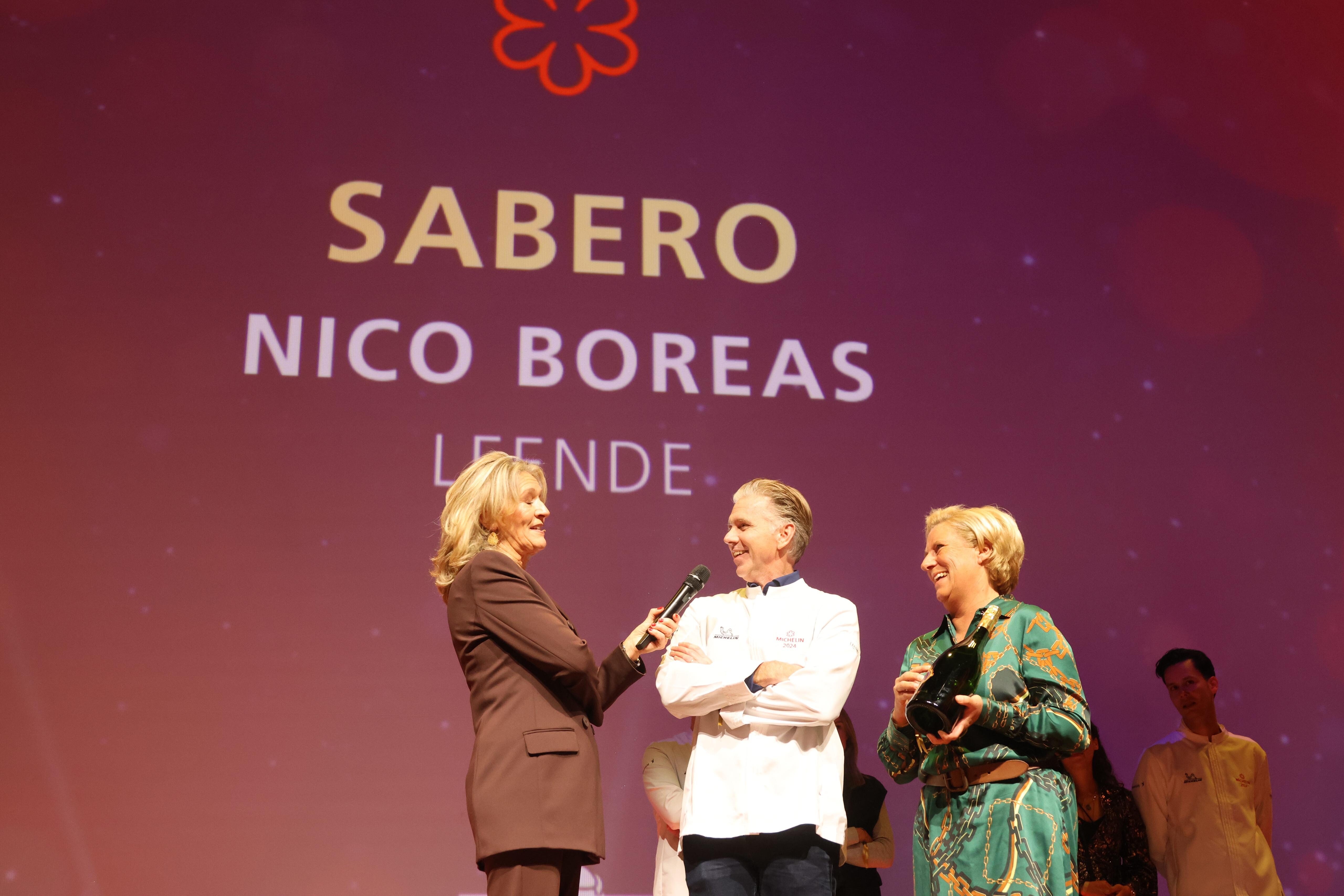Nico Boreas en zijn vrouw Sonja Boreas mogen op het podium komen. Restaurant Sabero in Leende pakt een ster. De twee staan er ontspannen bij. Van Trier noemt de twee een 'gouden koppel'.