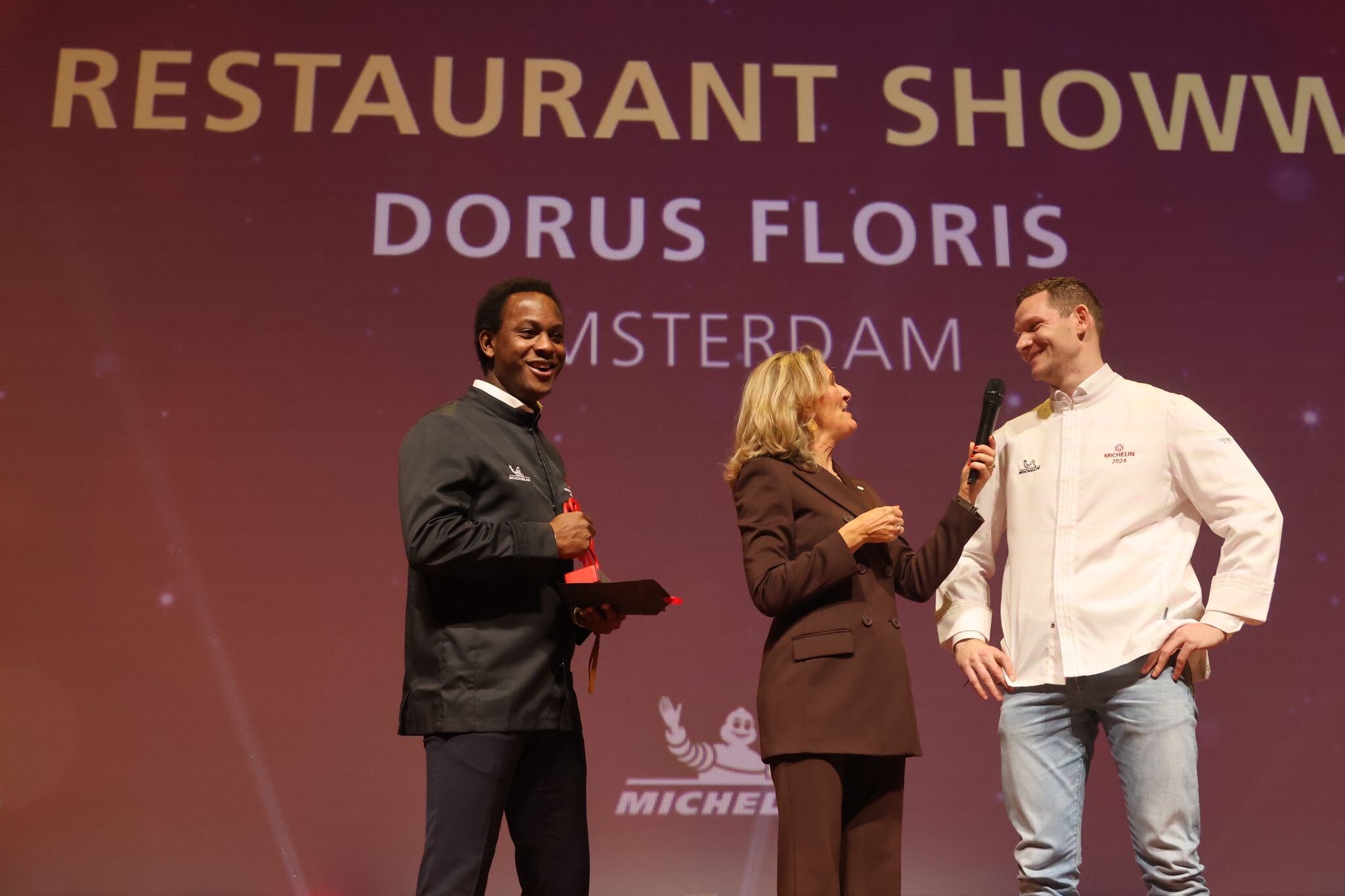 Lendl Mijnhijmer mag blijven staan en het eerste restaurant met een ster bekendmaken. En dat is ... zijn eigen restaurant Showw in Amsterdam, enkele maanden geopend tegenover de RAI. "Dorus, je mag naar voren komen, we hebben de ster!", roept Mijnhijmer. Wat een blijdschap bij deze heren!