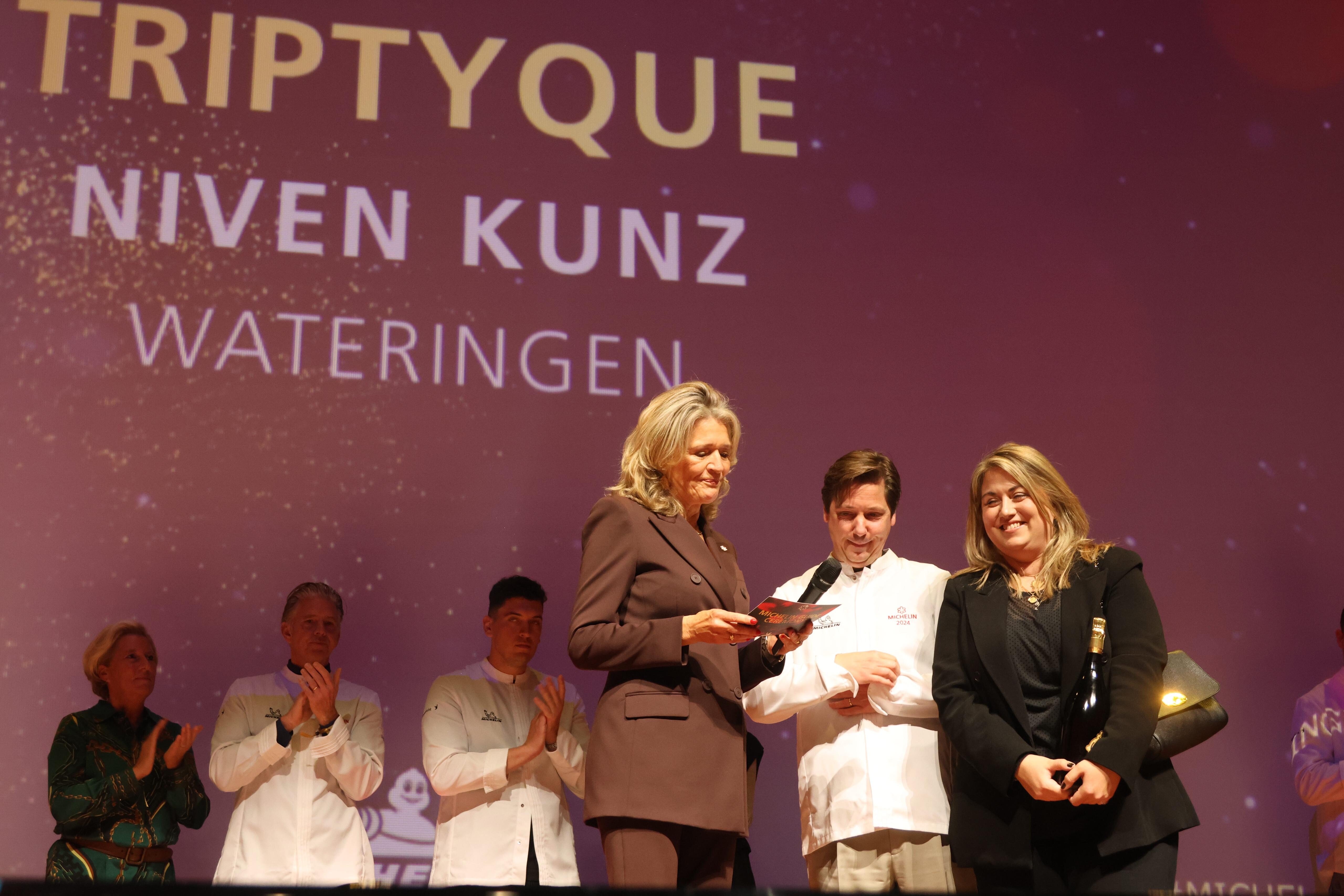 En snel door naar ..... Wateringen! Restaurant Triptique van Niven en Virginie Kunz krijgt die felbegeerde ster. Een mooi woord van Niven voor zijn vrouw: "De helft van de ster komt door haar." De inspecteurs zijn zeer onder de indruk van de steak tartare van wortel. Maar niet alleen dat: "Waanzinnig knap wat zij doen in de keuken."