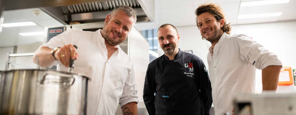 Voor de 6de editie van de truffel kick-off heeft 5&33 chef Mirko Bischèri de handen ineengeslagen met niet één, maar twee chefs: Freek van Noortwijk, bekend van o.a. zijn rol als jurylid in Masterchef, en chef Guillaume de Beer. Samen met een derde compagnon vormen zij The Breda Group en zijn eigenaren van vier restaurants in Amsterdam. De truffels van het 4-gangen menu worden in Umbrië, Italië verzameld en om de dag naar de keuken van 5&33 vervoerd. In de keuken worden de truffels nauwkeurig gewogen en vervolgens verwerkt in de gerechten. 5&33 gebruikt voornamelijk witte truffels, de luxere variant onder de truffels. De twee gastchefs hebben hun favoriete truffelgerecht, gefrituurde bloemkool met Hollandaise saus en truffel, toegevoegd aan het menu. “Wij vinden het gaaf om een simpel, oer-Hollands product als bloemkool te laten floreren door te combineren met een delicaat en exclusief product als truffel. Dit signatuurgerecht komt ieder jaar wel ergens terug in een van onze restaurants. We vinden het dan ook heel tof om het truffelseizoen hiermee feestelijk te starten bij 5&33”. aldus Van Noortwijk.