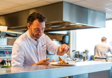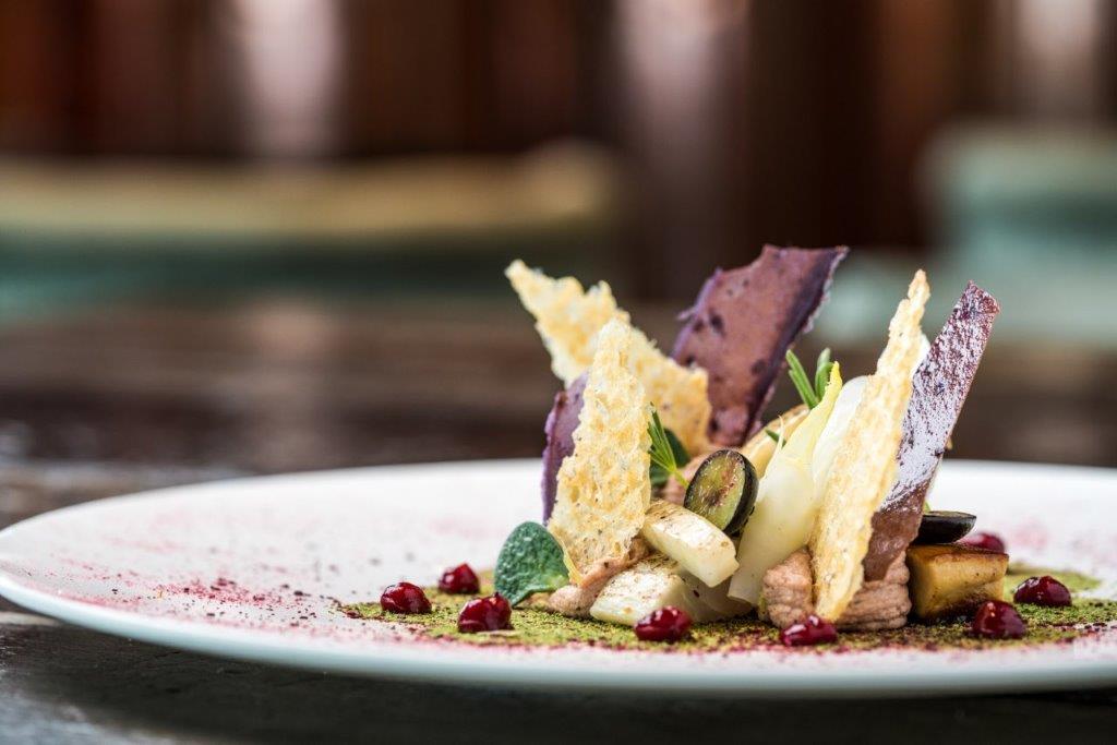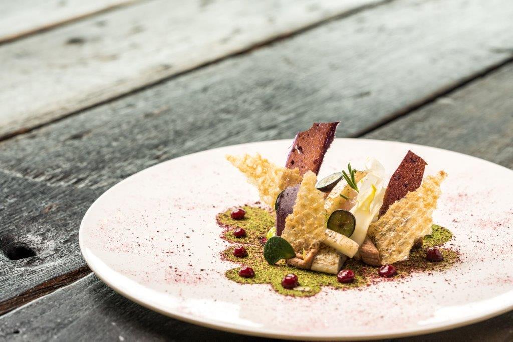 Het signatuurgerecht van Van Hoof is de dorade gemarineerd in Manzanilla sherry met gebakken ganzenlever, frambozen en crispy kippenhuid. Een verrassende combinatie volgens de chef. “Door vis te combineren met vlees creëer je bijzondere smaken. Zo breekt het zuur van de frambozen het vet af in je mond van de ganzenlever. Het verrast en dat vind ik altijd een mooi element aan een gerecht.”