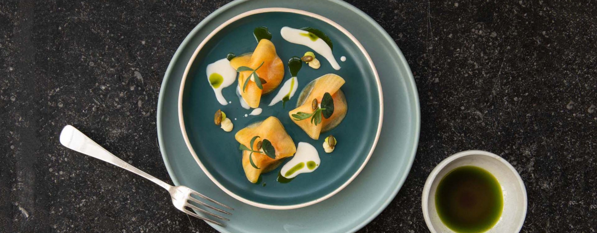 Zeeduivel, gepofte aubergine, beurre blanc van gefermenteerde paprikasap
