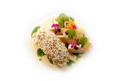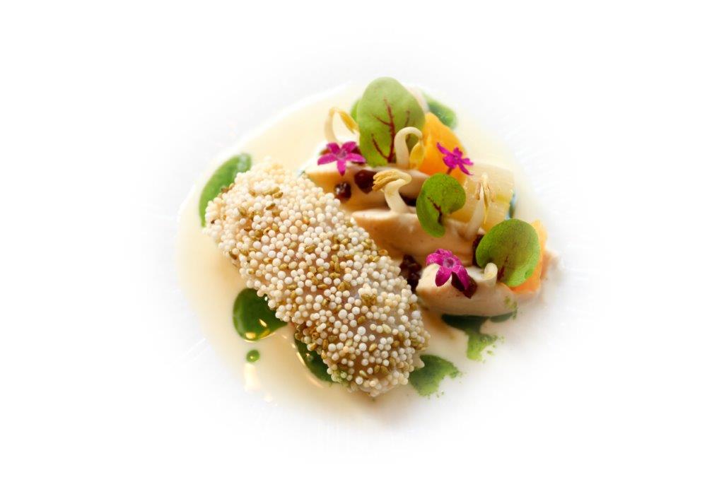De vierde gang wordt geserveerd in combinatie met een mocktail die niet alleen zoete en zure smaken bevat, maar ook een verrassende zoute touch. Een smaak die niet alleen de nieren en blaas ondersteunt, maar ook mentaal een boost geeft. Daarnaast zorgen de smaken van hibiscus, osmanthus, pruimen, honing en limoen voor een verfrist smakenpalet voordat de laatste gang wordt opgediend.