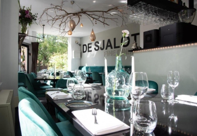 Chef-eigenaar Sibrecht Benning: “Het interieur staat voor wat ik wil uitstralen met mijn keuken. Net als mijn keuken, ademt de sfeer in het restaurant tegelijkertijd Frankrijk en Arabië uit. Franse details zijn de zwart gelakte tafels met de tafelpoten in bistrosfeer. De lampen en de prachtige kleur groen vormen de Arabische accenten. Eyecatchers zijn de glinsterende muur met de naam De Sjalot erop en de boomtak aan het plafond die uit mijn eigen moestuin komt. Extra warmte komt van de met groene stof beklede stoelen en het antracietkleurige tapijt, die beide ook de akoestiek ten goede komen. De bar is verplaatst en voor een goede wijnbehandeling heb ik klimaatkasten aangeschaft. Zowel binnen als buiten op het vernieuwde terras is plaats voor 28 gasten.”