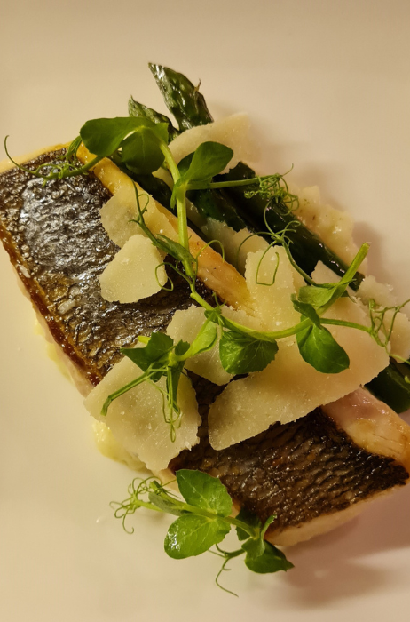 *Tekst gaat verder onder de foto's van Machiels en zijn gerecht zeebaars met risotto (rechts).