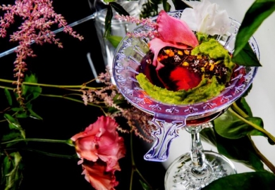 Het gerechtje bestaat uit avocadopuree, met daaroverheen geraspte pure chocolade, sinaasappelzest, gepofte rijstkorrels met daarop een viooltje. Het is een aperitiefhapje dat volgens de bartender oogt als een vrolijk bloementuintje. “Zonder overheersende smaken, want het hoofdingrediënt van de cocktail, de Geranium gin, wilde ik goed tot zijn recht laten komen. Samen hebben we uitgebreid geproefd om te kijken welke smaken er goed bij passen. De cocktail en het gerechtje gaan heel mooi samen, ze versterken elkaar.”