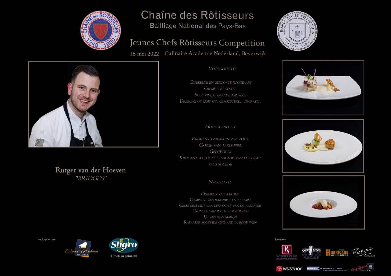 Rutger van der Hoeven heeft de vooraanstaande kookwedstrijd Jeunes Chefs Rôtisseurs van Chaîne des Rôtisseurs gewonnen. De souschef van restaurant Bridges in Amsterdam versloeg maandag 16 mei in Beverwijk vier jonge en talentvolle collega’s en mag in oktober Nederland vertegenwoordigen tijdens de internationale finale in Mexico.