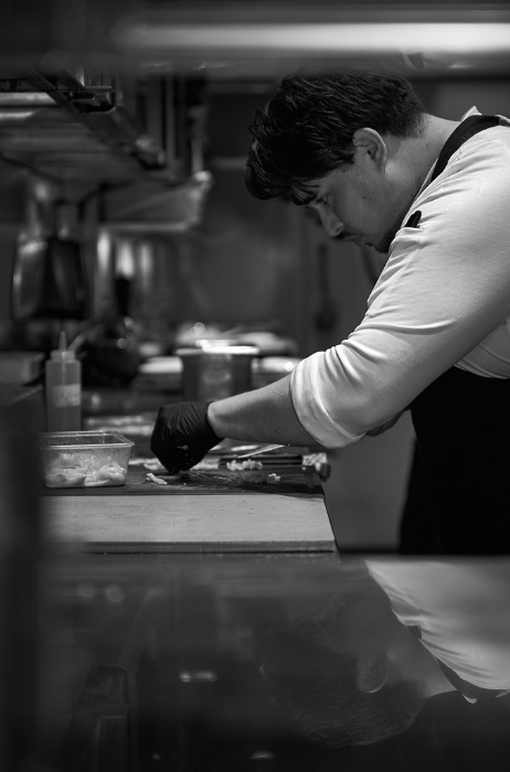 “Ik heb Peruaanse roots, maar ik voer geen Peruaanse keuken – hoewel er soms knipoogjes naar zitten. We serveren een meergangenmenu, een belangrijk onderdeel van onze identiteit is dat we veel werken met vis en schaal- en schelpdieren. Ons hoofdgerecht is vaak vlees, maar verder is het menu lichter en op vis gericht. Ik ben opgegroeid aan de kust van Peru, onbewust werkt dat door in mijn keuken.”