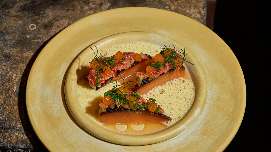 In het huidige menu, dat elke twee maanden wisselt, komt deze stijl onder meer terug in gerechten als zeebaars met kiwi en pijnboompitten, Noordzeekrab met koffie en macadamia en rog met geblakerde ui en een schuim van ‘nduja.