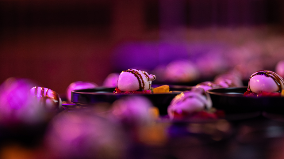 Het dessert was een theatrale afsluiting: een model werd op het podium omgetoverd tot levend nagerecht, met chocolade, soesjes en brownies. Voor de gasten die de voorkeur gaven aan een klassiek bord, was er een brownie met karamel, popcorn en kokos.