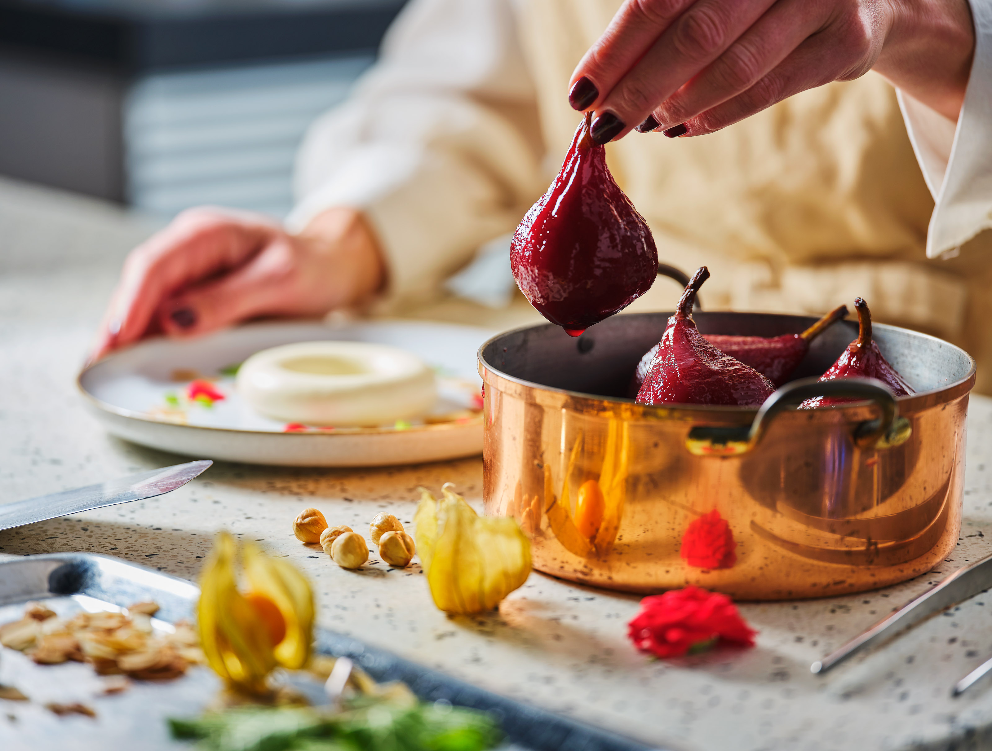 Voor dit gerecht is de Debic Panna Cotta Ring gebruikt – deze is gemaakt van verse panna cotta met echte vanille – in combinatie met stoofpeer. Het dessert is gegarneerd met duindoornbes, vene cress en hazelnoot.