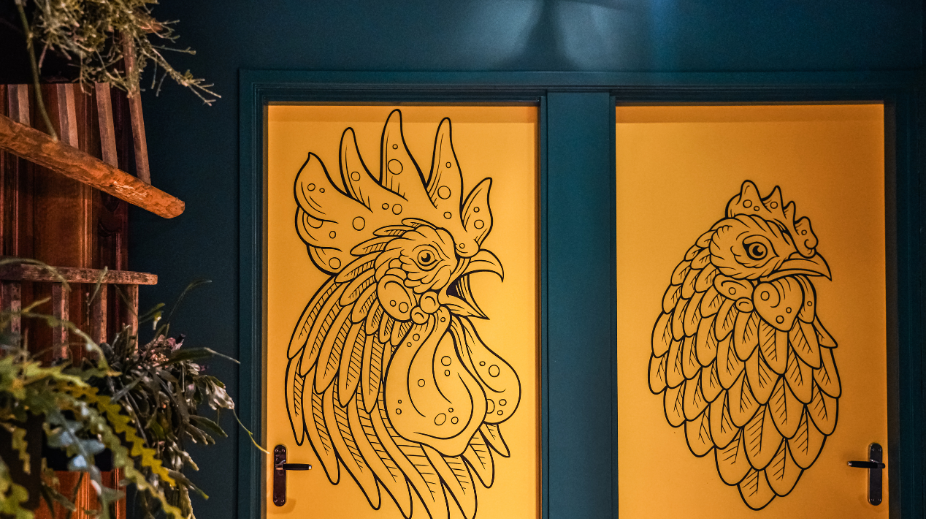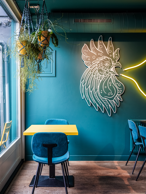 Met Pollo opende ondernemer Vincent Hoekstra het eerste kipconcept op Texel. Een toegankelijke zaak waar met eenvoudige en effectieve middelen een spectaculair interieur is gerealiseerd. De dominante kleuren zijn geel en turquoise, aan het plafond hangen veren en aan de wand prijkt een hen wier gekraai wordt weergegeven met neonlicht. Het hele interieur is aangekleed met bijzondere vormen van eikenhouten latten. Bij de op maat gemaakte kruidenwand kunnen gasten hun eigen kruiden plukken.