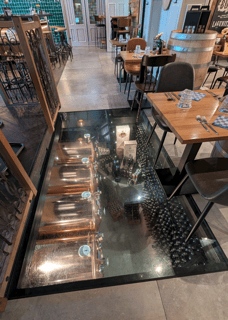 Vanuit het restaurant kijken gasten in de bierkelder.