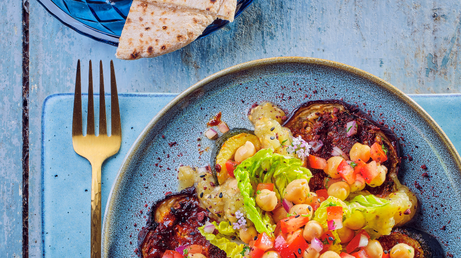 Of het nu op toast wordt uitgesmeerd of als dip wordt geserveerd, deze puree geeft je gerechten een authentieke smaak. Voor dit gerecht is gekozen voor een Midden-Oosterse salade met kikkererwten, tomaat, rode ui, geroosterde courgette en aubergine, limoensap, little gem en sumackruiden, afgetopt met de auberginepuree.