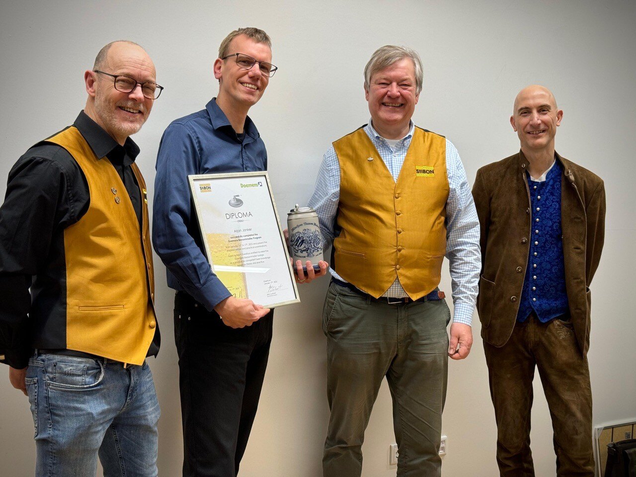 Op de foto v.l.n.r. Gijs Troost (examencommissie StiBON), Arjan Jonker (Bierbeleving), Henri Reuchlin (coordinator StiBON Bieropleidingen) en Jens Luckart (Doemens)