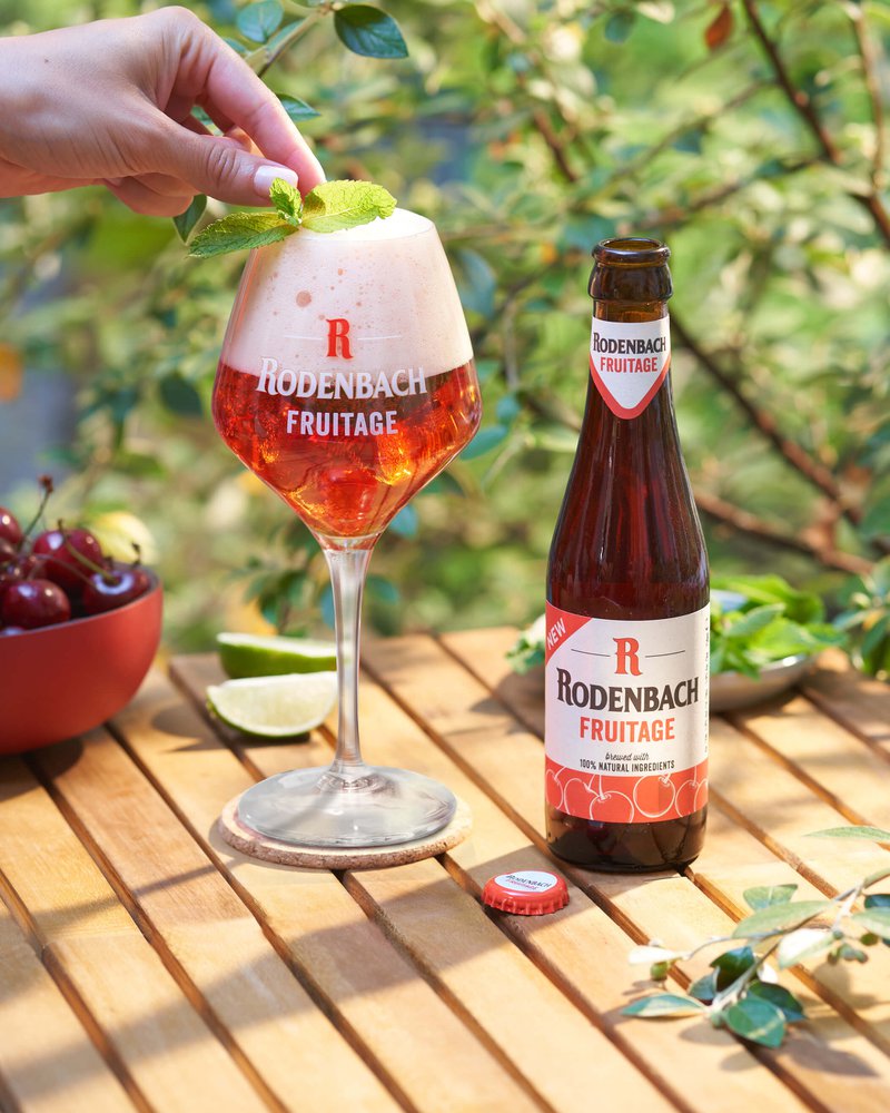 Zo wordt Rodenbach FruitAge verrijkt met 100% natuurlijk kersensap, en worden kunstmatige smaakmakers zorgvuldig vermeden. Het resultaat is een fris, licht zoetzuur bier met een laag alcoholgehalte – perfect voor een zomers terras. Je kunt het zelfs als een heuse biercocktail serveren door het over ijsklontjes uit te schenken en te garneren met takjes munt en een schijfje limoen. Hoeft niet, kan wel!