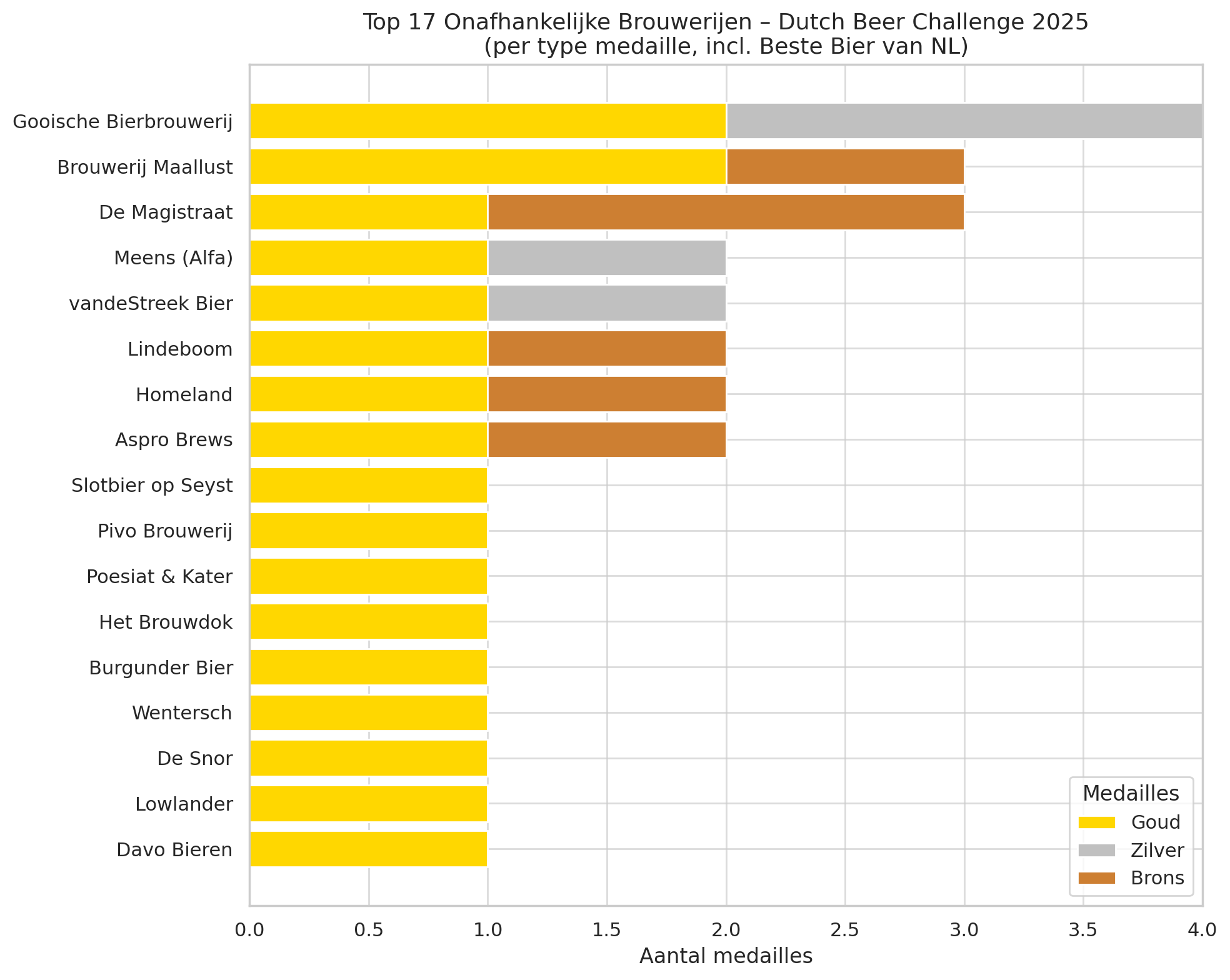 In het rijtje winnaars valt één brouwerij bijzonder op: de Gooische Bierbrouwerij. Als enige brouwerij in Nederland heeft zij tweemaal het beste Bier van Nederland gebrouwen. Wanneer we de gouden medaille en met de Mitra Award (Beste Bier van Nederland 2025) bekroonde inzending van Stichting Slotbier op Seyst (gebrouwen bij de Gooische) meetellen, voert de Gooische de lijst aan van de 17 meest succesvolle onafhankelijke brouwers van de Dutch Beer Challenge 2025.