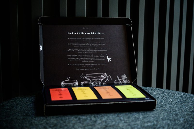 Axis Cocktail Bar, te vinden in Hilton Amsterdam Airport Schiphol, komt met een cocktailconcept voor thuis: Axis Signature Cocktail Box. De cocktails (er kan gekozen worden uit vijftien stuks) worden verstuurd in een mooi vormgegeven box, die precies door de brievenbus past.
