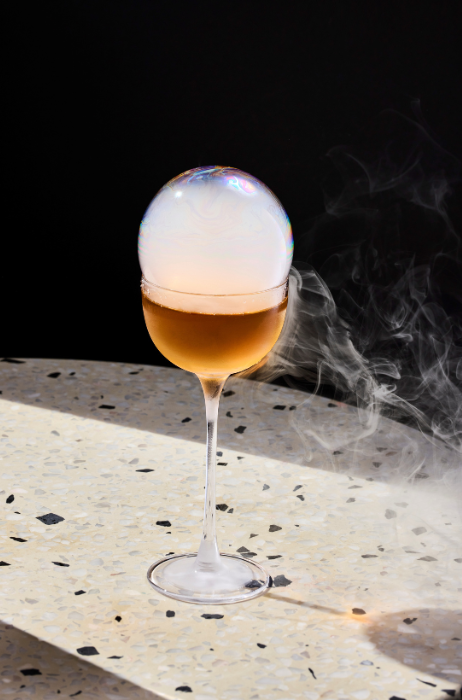 “Deze cocktail serveerden we gebatched. Schenk de cocktail uit een gekoelde fles in een mixing glas gevuld met ijs. Stir kort en strain in een gekoeld Nick & Nora-glas. Garneer met een bel van eikenhoutrook uit een flavour blaster.”