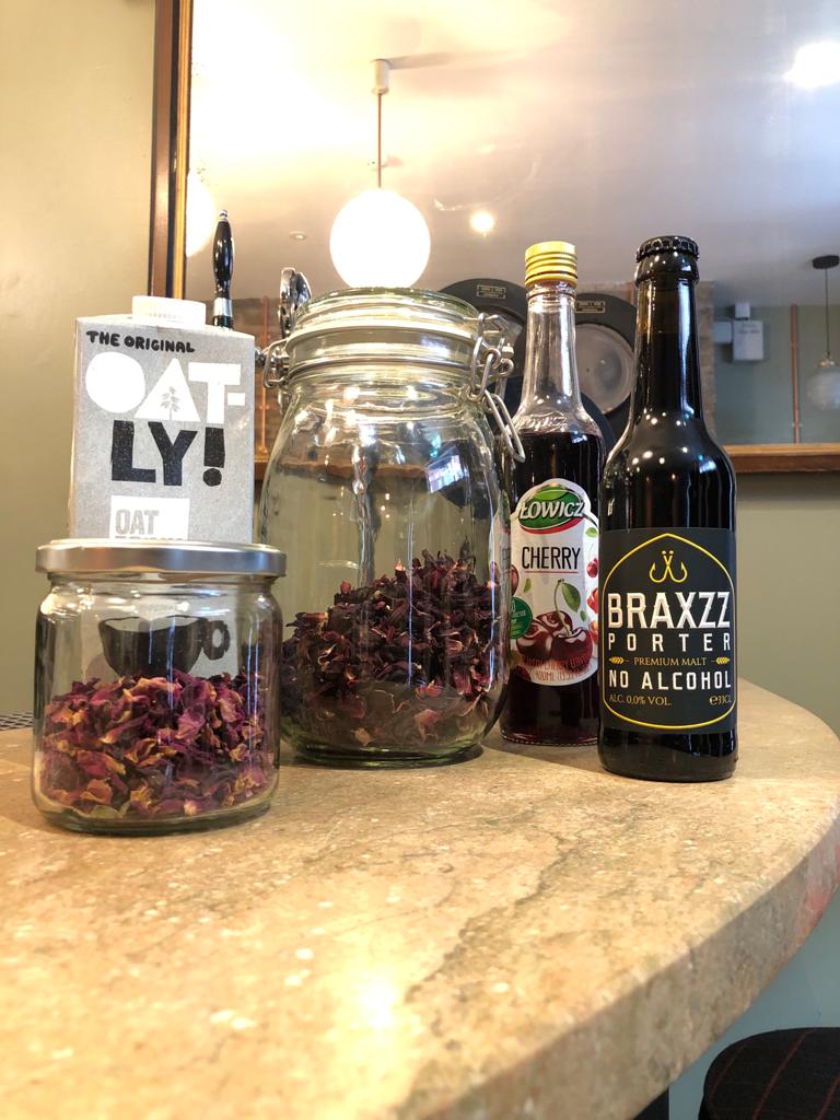 Ingrediënten: 70 ml hibiscus infused havermelk, 50 ml Braxzz porter, 15 ml kersensiroop. Shake alle ingrediënten en double strain in een goed gekoeld glas. Garneer met gedroogde rozenblaadjes.
