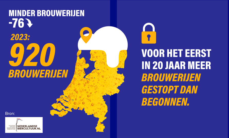 Voor het eerst sinds 2001 is het aantal brouwerijen afgenomen. Uit de gegevens van de Stichting Erfgoed Nederlandse Biercultuur blijkt dat in 2023 76 brouwerijen zijn gestopt waaronder 27 brouwerijen en 48 brouwerijhuurders. De redenen hiervoor variëren van faillissementen tot het de deuren sluiten omdat het niet langer rendabel was om bier te brouwen. Voorzitter Jan Ausems van Erfgoed Nederlandse Biercultuur: “Het past bij een gezonde markt dat brouwerijen hun deuren sluiten. Soms kiest men er zelf voor, bijvoorbeeld omdat het te duur wordt. Helaas in 2023 ook doordat brouwerijen failliet gingen of failliet dreigden te gaan. Gelukkig zijn in 2023 ook 51 nieuwe brouwers begonnen. Maar voor het eerst sinds ruim 20 jaar was het saldo wel negatief. Dat is zorgwekkend want we hebben in Nederland een prachtige biercultuur en dat willen we graag zo houden.”