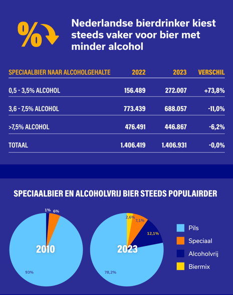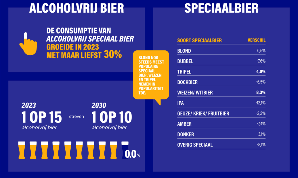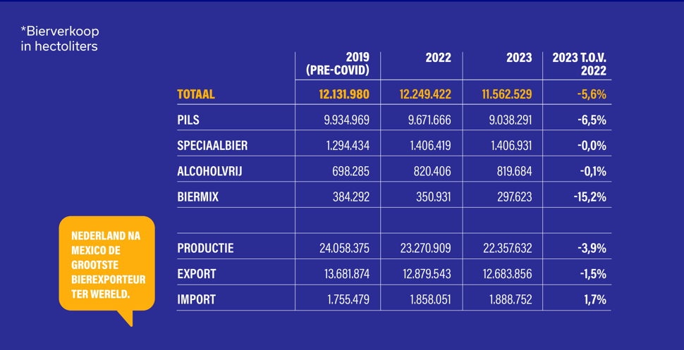 In 2023 is zowel de horeca- als de thuisconsumptie van bier gedaald. De verkopen van pils en biermixen (zoals Radlers) daalden respectievelijk met 6,5 en 15,2 procent. Waar de afgelopen jaren vooral de consumptie van speciaalbier en alcoholvrij bier groeide, bleef de verkoop dit jaar stabiel. Alcoholvrij speciaalbier groeide overigens wel sterk. Ook had de inflatie een negatieve impact op de verkoop. Daarnaast speelde ook het slechte zomerweer de biermarkt parten. Vooral biermixen zoals Radler, die vooral worden gedronken bij mooi weer, hadden daar veel last van, melden de brouwers in het persbericht.