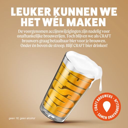 Een ander zich voortslepend dossier is de nieuwe accijnswetgeving die uitpakt in het nadeel van kleine brouwerijen. Juist de craft brouwers brouwen een breed scala aan mooie, bijzondere bieren, waarvan een deel zwaarder wordt belast onder de nieuwe wetgeving. Aan de andere kant van het spectrum, de bieren met geen of nauwelijks alcohol, is de stijgende verbruiksbelasting een plaaggeest. Een brouwerij die veel laag of niet alcoholische bieren maakt, heeft hier veel last van. Terwijl de overheid verantwoord alcoholgebruik wil stimuleren gaan deze bieren dus ook duurder worden. ‘Als je het optelt, statiegeld, de bijdrage die we aan het Afvalfonds moeten betalen en de accijnzen, dan is het erg veel", zegt Beersma.