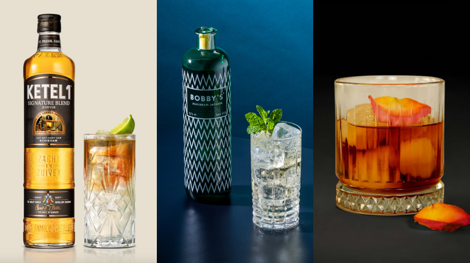V.l.n.r. KETEL 1 Signature Blend & Stormy, Cocktail Jenever Spring, Cocktail Paradise Bloom