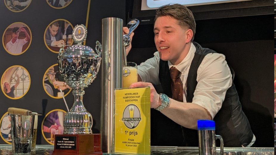 Tijdens de spannende finale van het Nederlands Kampioenschap Biertappen op Horecava 2025 toonden 50 bartenders hun vakmanschap en passie. Ivo Smeets maakte de meeste indruk op de vakjury en mag zich een jaar lang Nederlands Kampioen Biertappen noemen. “Een droom die uitkomt. Ik werk in het mooiste café van Nederland, waar elk biertje een kampioensbiertje moet zijn. Dit is zooo geweldig. Ben apetrots”, aldus een trotse Ivo Smeets.