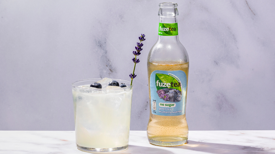 Bereiding: Schenk de likeur en witte rum in een glas met ijsblojes, knijp de limoen uit boven het glas en top af met Fuze Tea blueberry lavender no sugar.