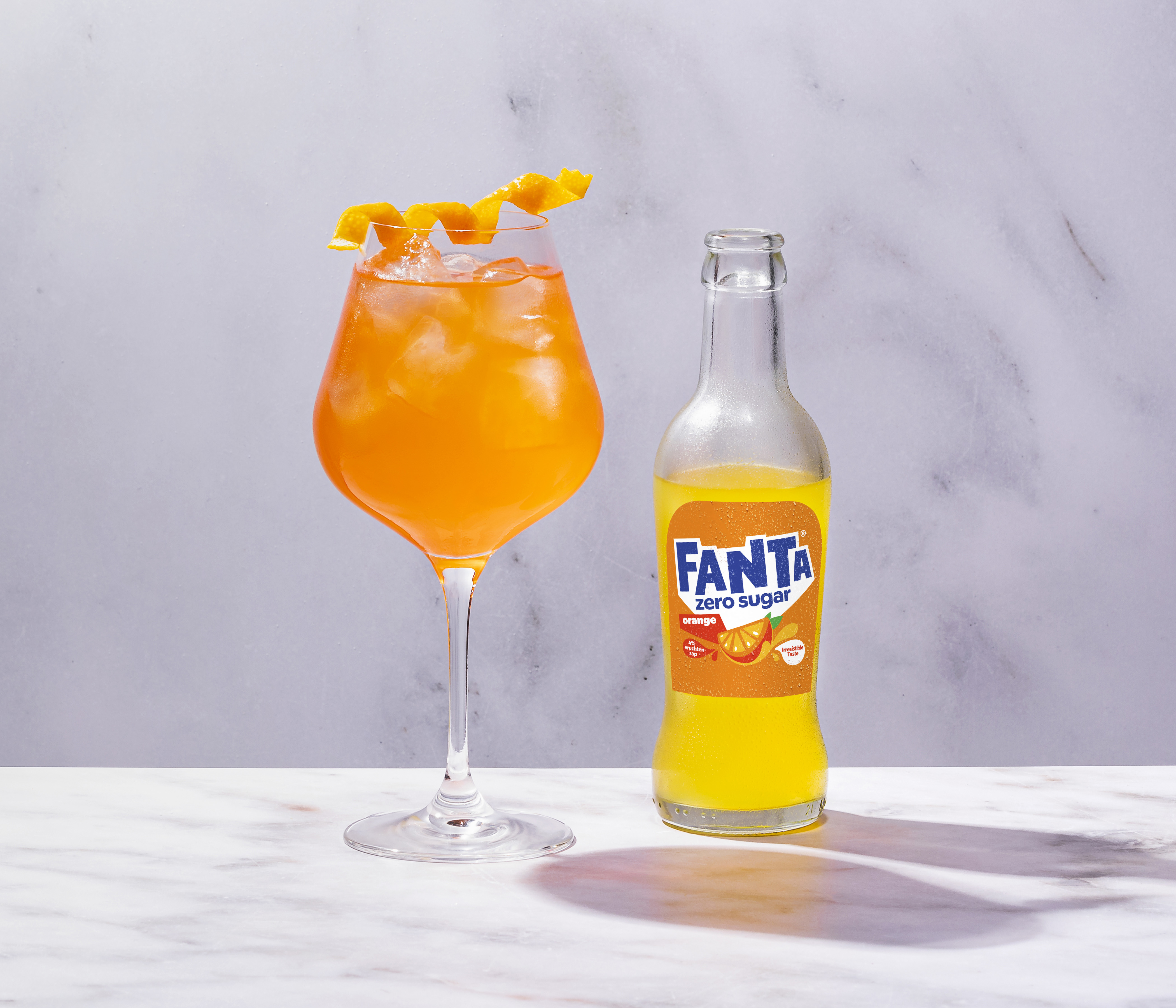 Bereiding: Vul het glas met ijs, schenk de spritz in het glas en top af met Fanta orange zero sugar. Roer het drankje kort door.
