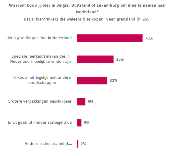 Een van de meest urgente punten in het onderzoek betreft de accijnsdruk. 41% van de Nederlandse bierdrinkers koopt weleens bier in Duitsland, België of Luxemburg, vooral vanwege lagere prijzen. De redenen zijn helder, namelijk lagere prijzen door minder accijnzen en grotere verpakkingen. Daarnaast minder of geen statiegeld en toegang tot specifieke merken of biertypen.