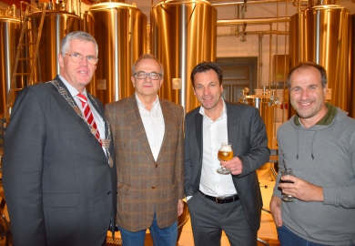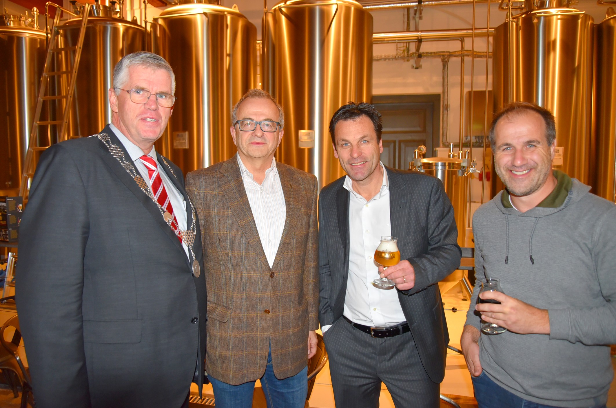 V.l.n.r. op de foto: burgemeester Ermelo Andre Baars, directeur Geldersch Landschap en Kasteelen Peter van den Tweel, eigenaar Brouwerij De Uddelaer Jacques Brinkman en ambassadeur Erik Kroon.