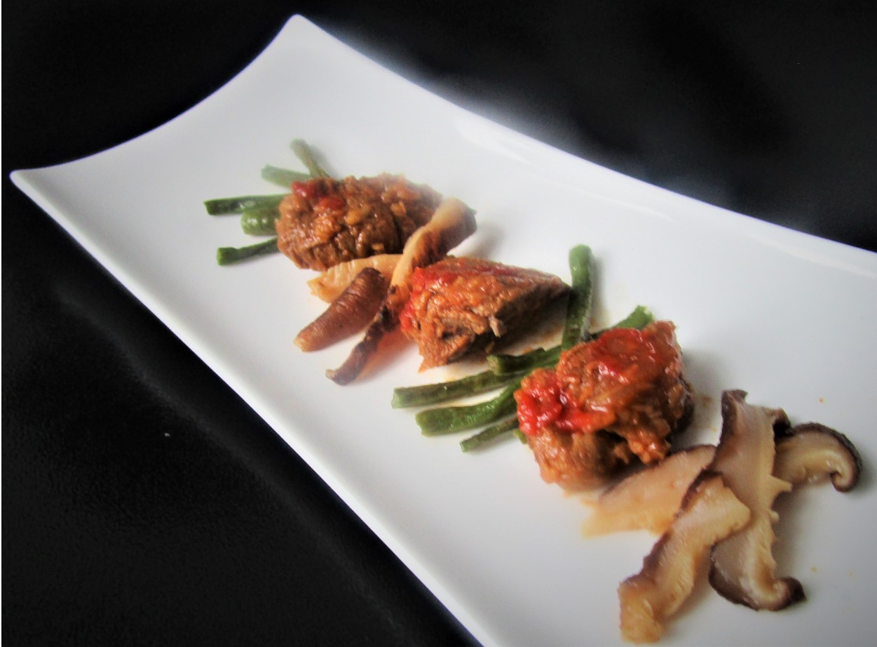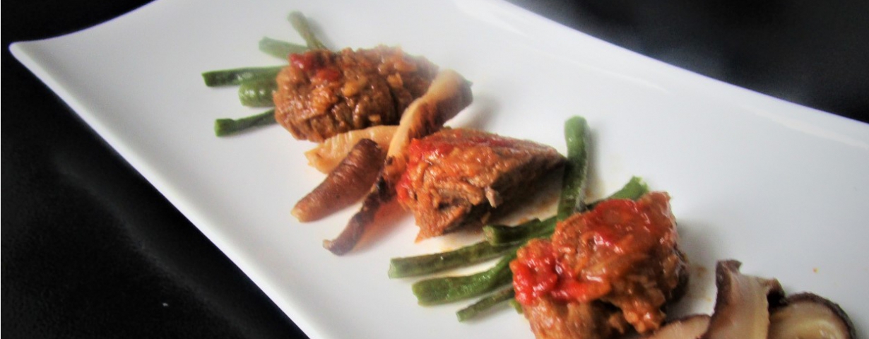 De blokjes vlees met weinig zout bestrooien en kort laten rusten. Vier eetlepels zonnebloemolie in een wok of braadpan verhitten en de blokjes aanbraden. De stukjes ui erdoor roeren en vervolgens 35 cl bouillon al roerende toevoegen. Hittebron op de laagste stand zetten en gedurende 2 uur met de deksel op de wok of braadpan laten pruttelen. De blokjes af en toe omkeren. Vijftien minuten voor het einde van de stooftijd de rode Thaise curry erdoor roeren en verder stoven. Vijf minuten voor het einde van de stooftijd de stukjes kokoscrème erdoor roeren tot ze zijn opgelost in het stoofvocht. In de braadpan of wok iets laten afkoelen. Tijdens het stoven de kousenband of dunne sperzieboontjes in stukjes snijden. In 2 tot 3 eetlepels zonnebloemolie in een wok of braadpan roerbakken. Knoflook en 15 cl bouillon toevoegen en 10 tot 15 minuten stoven. Tegen het einde van de stooftijd de geraspte verse gember erdoor roeren. Op smaak brengen met peper en zout. De reepjes of stukjes shiitake in een stoommandje boven heet water kort beetgaar stomen. Het vlees en de saus over voorverwarmde borden verdelen en met de groenten garneren. Serveren met droog gekookte witte rijst of mihoen. Aanbevolen bieren: Pils (naar smaak met veel hop), Saison, Blond bier tussen 6 en 9 vol% (bijvoorbeeld Tripel), India Pale Ale tussen 6 en 8 vol%.