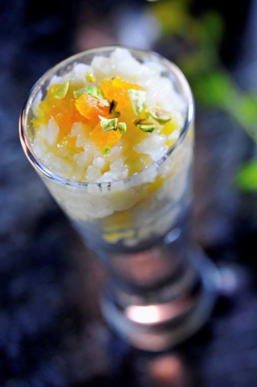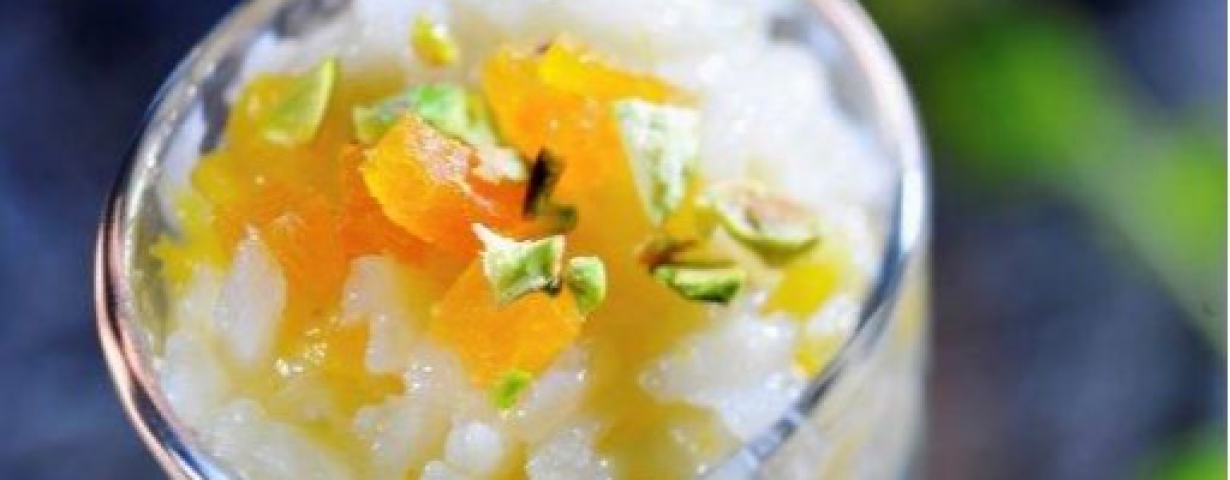 De gedroogde abrikozen in flinterdunne stukjes snijden en 2 uur in de abrikozenbrandewijn weken. Vanillestokje opensnijden en het merg eruit schrapen. De melk met vanillemerg in een pan met dikke bodem langzaam aan de kook brengen. De rijst bij beetjes toevoegen, goed roeren en op de laagste hittebron laten pruttelen. Af en toe zachtjes aan de kook brengen, goed roeren tot de rijst alle melk heeft geabsorbeerd. Als de melk door de rijst is geabsorbeerd, de stukjes gewelde abrikoos, de rest van de abrikozenbrandewijn en suiker erdoor roeren. Deksel op de pan zetten en op de laagste hittebron garen. Af en toe goed roeren. Naar smaak extra melk toevoegen, zodat geheel smeuïg blijft. De pan van de hittebron halen en de slagroom erdoor roeren. Over glaasjes of schaaltjes verdelen en gedurende 1 uur in de koelkast laten opstijven of naar smaak lauwwarm serveren. Met ontvelde, verkruimelde pistachenootjes garneren. Aanbevolen bieren: Proefglaasje (10 of 15 cl) Porter tussen 6 en 8 vol%, Quadrupel, Russian Imperial Stout. De aangename zoetige smaak van dit dessert en de subtiele smaak van de pistachenootjes past goed bij de volmondige, licht zoete smaak van deze bieren.