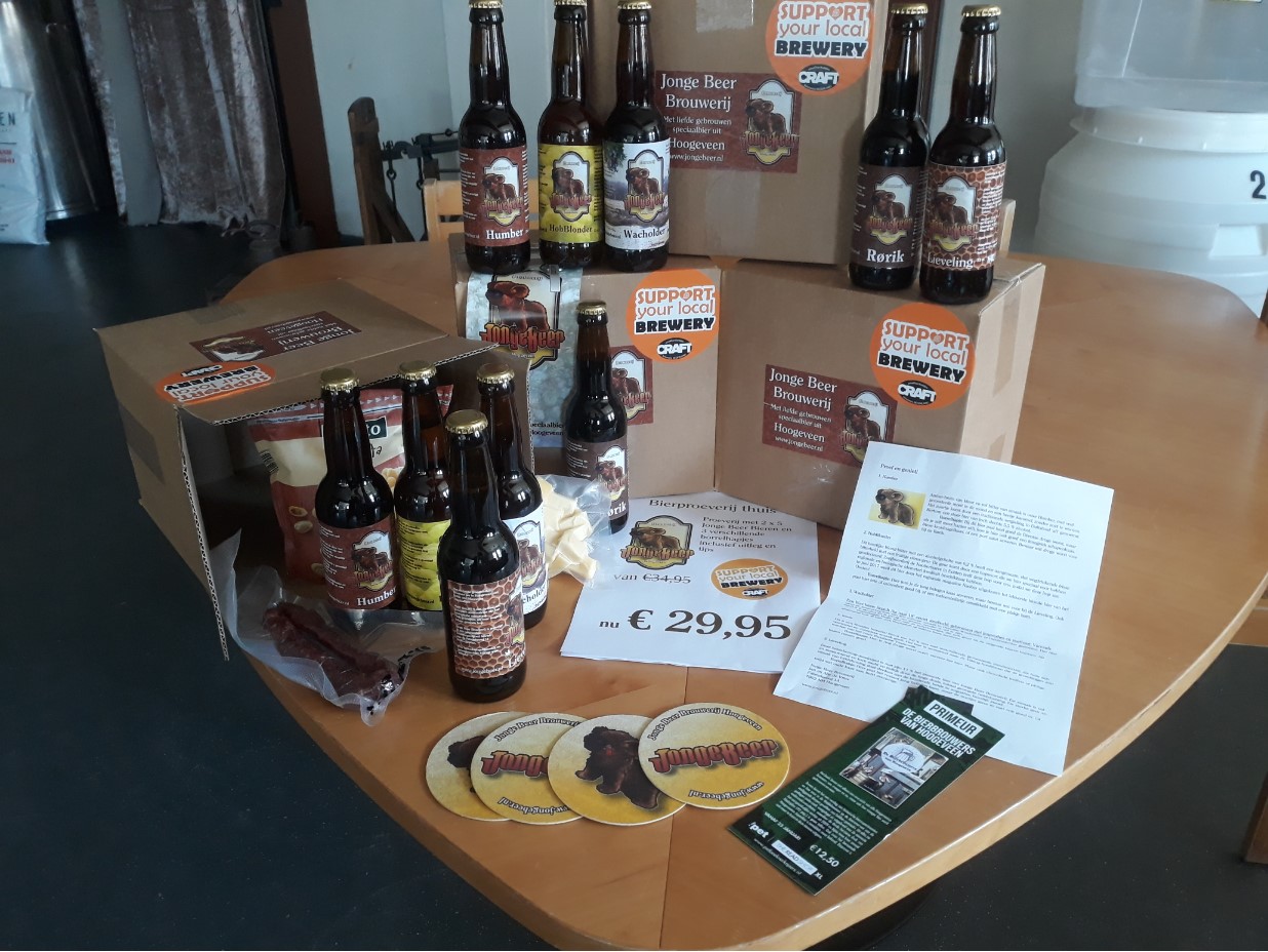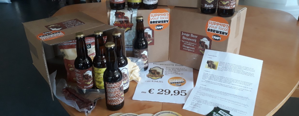 “Om tijdens deze moeilijke tijd toch lokaal bier te kunnen drinken terwijl je niet naar je eigen café kunt, en ook geen proeverij kunt boeken in de brouwerij, hebben wij een leuke BierProeverijBox samengesteld voor vier personen. Een doos met 2 x 5 flessen bier en 3 borrelhapjes, met uitleg en tips. Deze goed gevulde doos zetten we in bij de lokale slijter, maar kan op afspraak ook bij de brouwerij gehaald worden”, vertelt Jan de Vries van de Jonge Beer Brouwerij in Hoogeveen