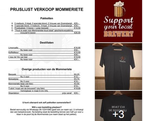 “Onze deuren zijn gesloten in verband met het coronavirus. Wij begrijpen deze maatregel en vinden ook dat gezondheid boven alles gaat”, zegt Carina kelder van Brouwerij Mommeriete in Gramsbergen. “Support your local brewery is een begrip geworden. Totdat wij weer open gaan kunnen onze gasten en andere bierliefhebbers bier en gerelateerde producten, zoals onze tasjes en t-shirts en gedestilleerd gewoon bestellen en afhalen. We nemen bestellingen aan via Whatsapp 0612241086 en na betaling zetten wij de bestelling klaar.”