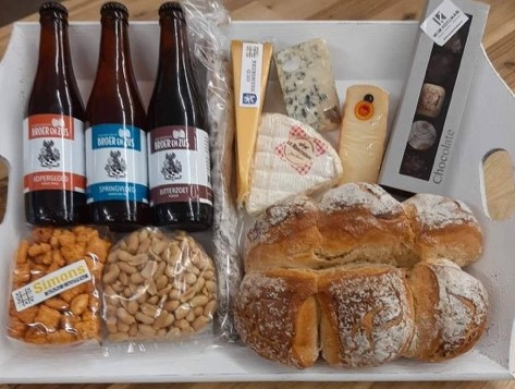 “Inmiddels is de bovengenoemde uitspraak welbekend. Daarom hebben wij de handen ineen geslagen met Simons Kaas & Noten en met Wim Koelman, Brood-Banket-Bonbons uit Heemskerk. Na wat brainstormen is een fraai pakket samengesteld met daarin onder andere natuurlijk diverse kazen en noten, maar ook luxe bonbons en heerlijke speciaalbieren. De prijs van dit uitgebreide pakket is € 30,- en kan, indien gewenst, gratis worden thuisbezorgd. Zoals altijd bezorgen we het gratis in de volgende gemeenten: Heemskerk, Beverwijk, Velsen-Noord, Wijk aan Zee, Uitgeest en Castricum, andere plaatsen op aanvraag.